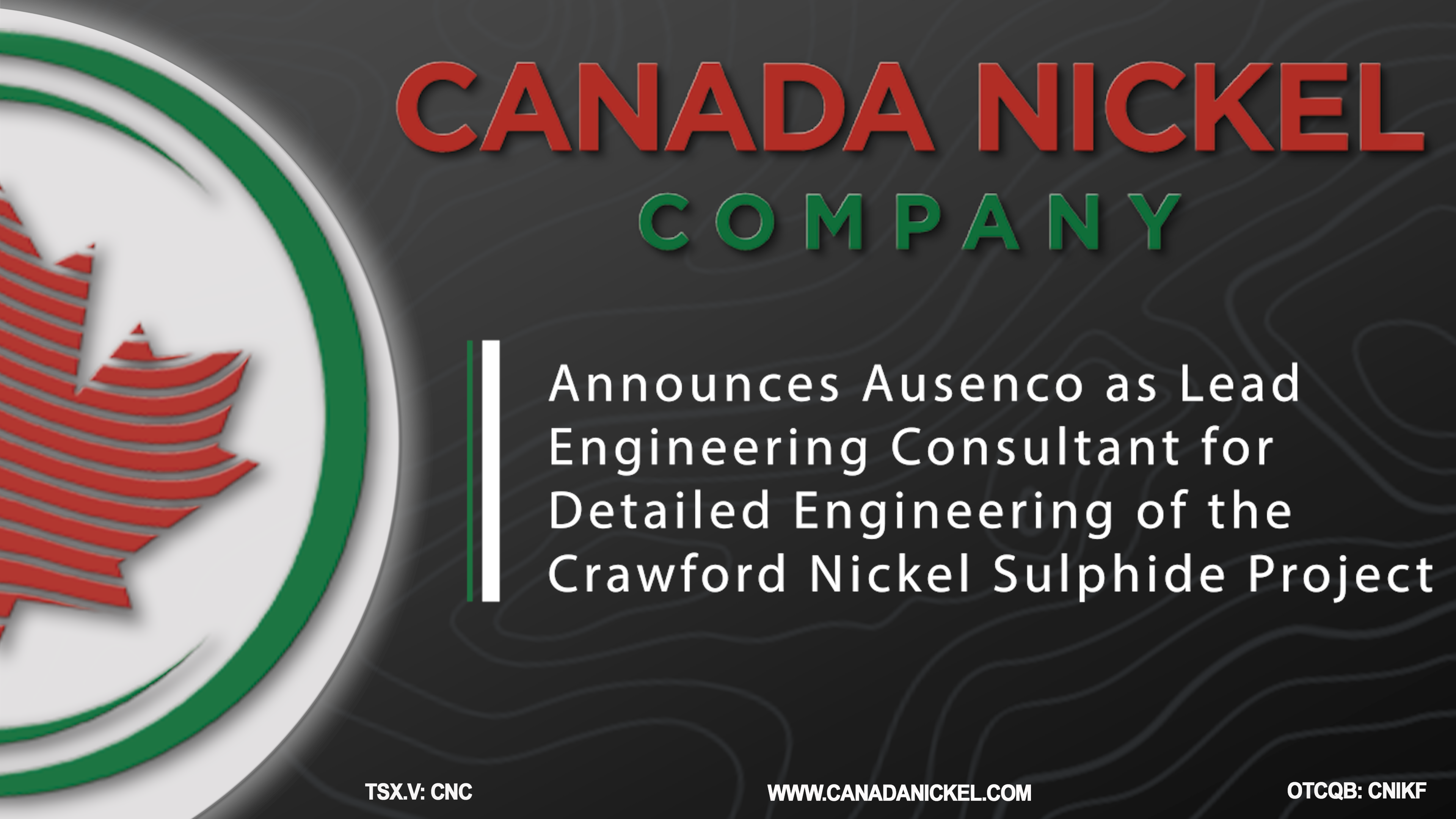 TORONTO, Jan. 26, 2026 – Insidexploration – Canada Nickel Company Inc. (“Canada Nickel” or “the Company”) (TSXV: CNC) (OTCQB: CNIKF) is pleased to announce that it has awarded Ausenco Engineering Canada ULC (“Ausenco”) a contract to commence detailed engineering for the Process Plant and supporting infrastructure at the Company’s Crawford Nickel Sulphide Project, and to provide overall project support as the Company targets commencing construction on Crawford by year-end.