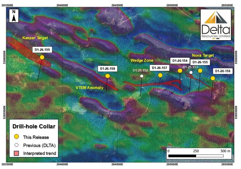 Toronto, Ontario – February 27, 2026 – Delta Resources Limited (TSXV: DLTA) (OTC Pink: DTARF) (FSE: 6GO1) (“Delta” or “the Company”) is pleased to report the preliminary interpretation from the 2024-25 till survey conducted by IOS Géosciences in the I-Zone sector, located approximately 18 kilometres southwest of the Eureka Gold Deposit and about 60 kilometres west of Thunder Bay, Ontario. The till survey, completed in the fall of 2025 (see September 17, 2025 news release), has identified at least three significant gold anomalies and one nickel anomaly, further reinforcing the potential for expansion and new discoveries in the area. Delta is also pleased to report assay results from its most recent regional exploration drill program at the Delta-1 Gold Project.