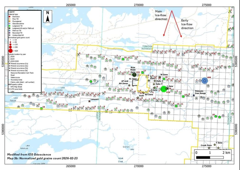 A third anomalous sample returned 152 normalized gold grains and is interpreted to be derived from the New Road Zone, a known gold occurrence previously identified by Delta Resources as a high-priority exploration target that has not yet been drill tested.