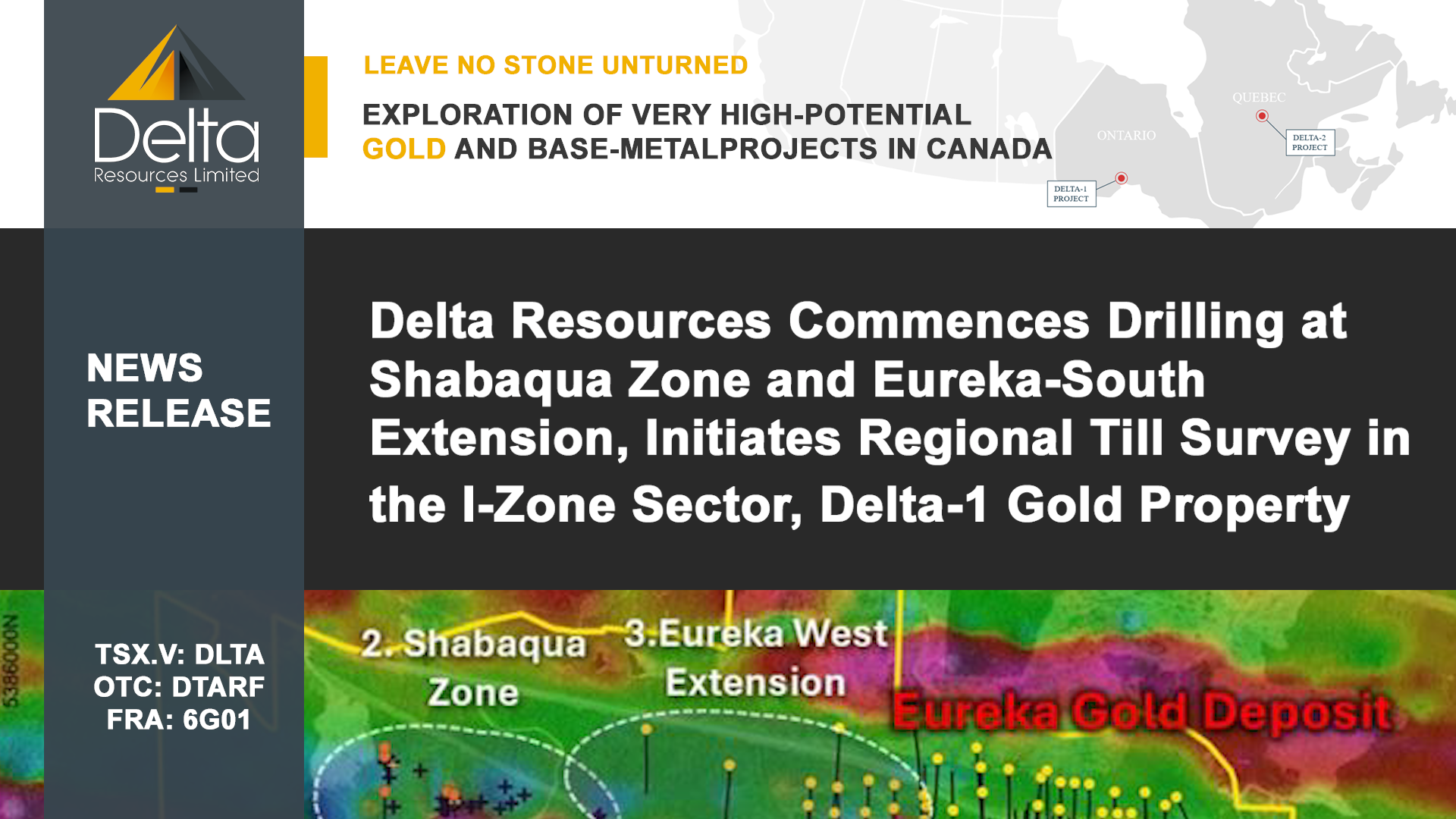 Delta Resources Commences Drilling at Shabaqua Zone and Eureka-South Extension, Initiates Regional Till Survey in the I-Zone Sector, Delta-1 Gold Property