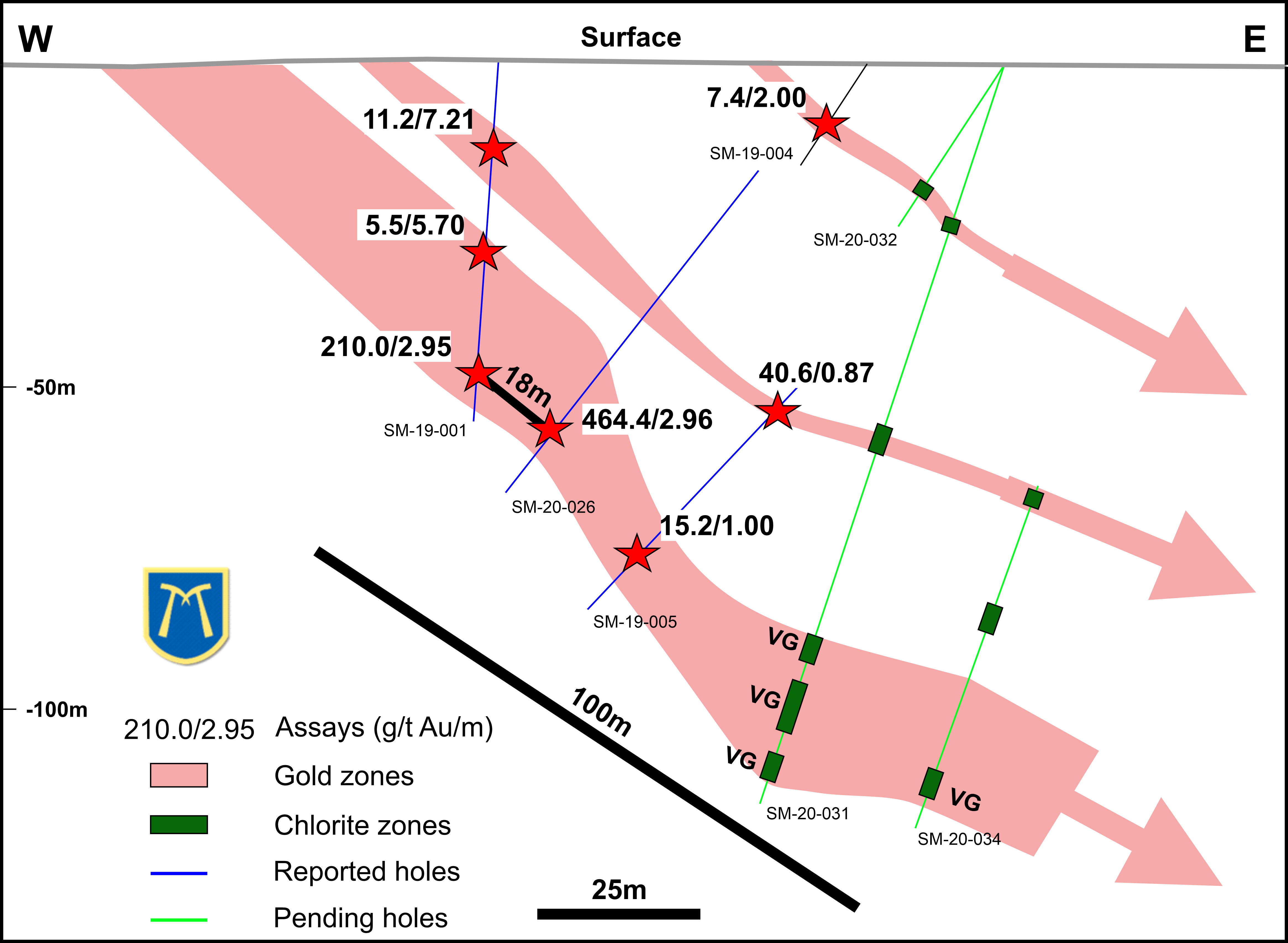 The re-analysis of hole SM-20-026 was undertaken to confirm the extremely high-grade results that were obtained 18 metres downdip from the high-grade intersection of 52 g/t gold over 12 metres in SM-19-001 (see September 27, 2019 News Release here). Results to date indicate that the high-grade gold zone in the Bristol/Monaco Structure could extend over 100 metres downdip following the preliminary observation of visible gold (VG) in holes SM-20-031 and SM-20-034 (Figure 1). Assay results from the pending drill holes will be announced as they are received.