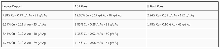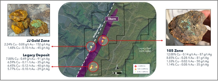The exploration program performed last fall confirms multiple high-grade copper-silver-gold occurrences outside and adjacent to the historical Legacy Deposit area. Surface sampling* returned values up to 12.00% Cu, 1.15 g/t Au and 152 g/t Ag, supporting the interpretation of a broader, multi-zone mineralized system. *The reader is cautioned that grab samples are selective by nature and may not reflect the actual metal content of the mineralized zone.