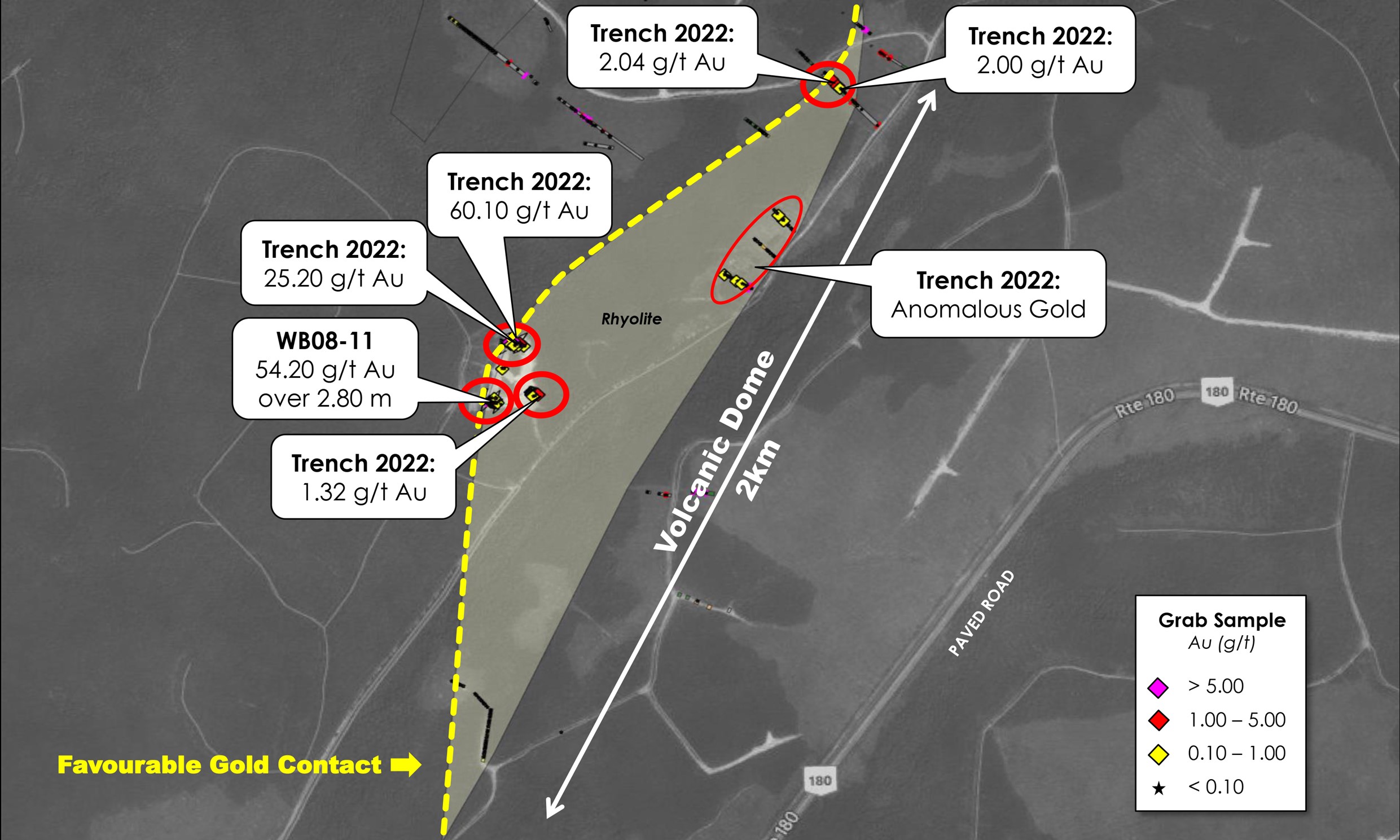 The CGZ likely represents another major felsic dome at Williams Brook. Gold mineralization occurs in high-grade gold veins within a larger altered/lower-grade envelope, with several grab* samples returning anomalous gold values sometimes exceeding 0.20 g/t Au. So far, the rhyolite has been traced on surface over 2.0 km by 350 metres (Figure 2).