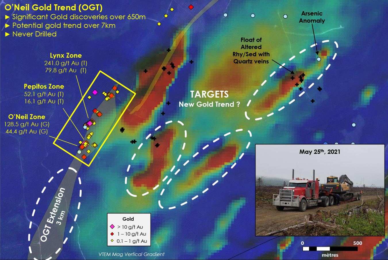 The main focus of the current program is to detail and expand the recent major gold discoveries along the O’Neil Gold Trend (OGT) traced over 650 meters with bonanza grades up to 241.0 g/t Au. OGT will also see specific work in preparation of the imminent inaugural drilling program that should begin in June 2021.
