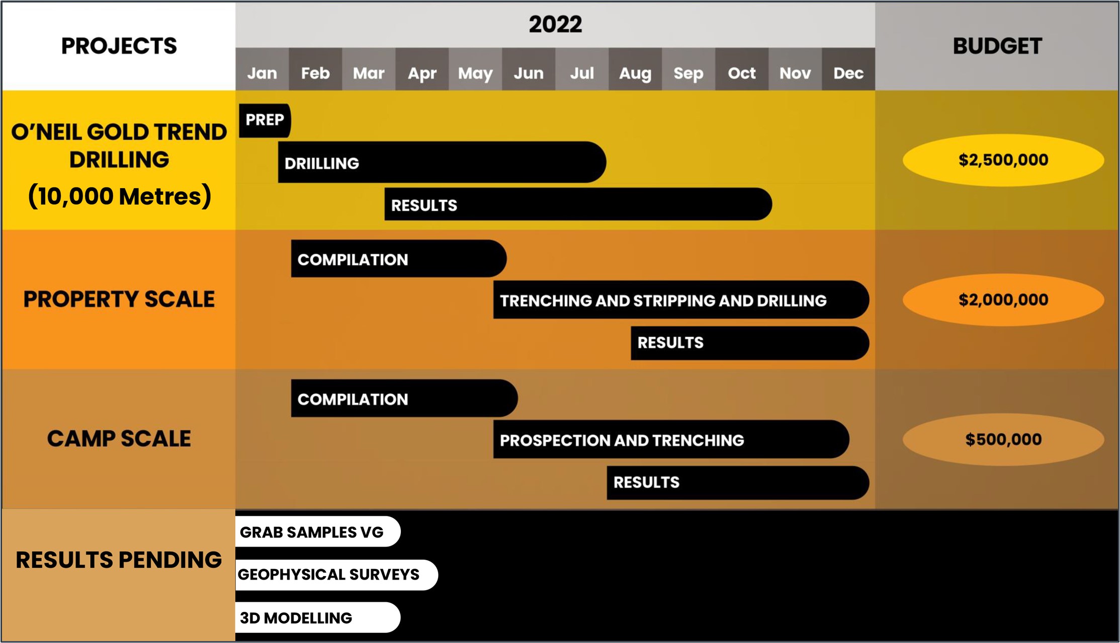 10% of the current $5M exploration budget is allocated to camp-scale exploration. The main objective of this program is to locate the next gold trend on those properties for the 2023 exploration program.