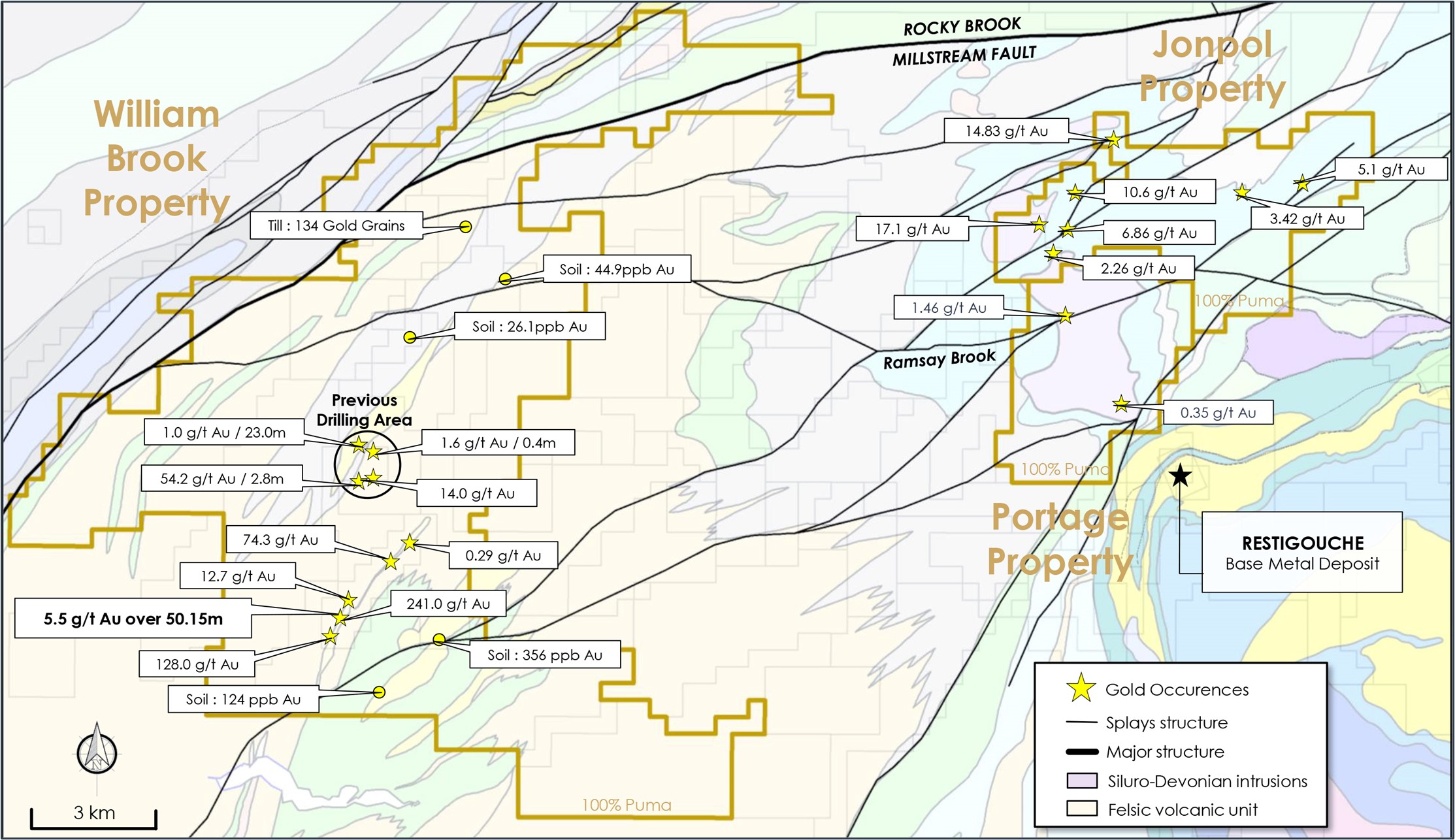 WILLIAMS BROOK CAMP-SCALE EXPLORATION PROGRAM Following the current compilation work of Puma’s entire landholdings, the Company will launch a Camp-Scale Exploration program (see Figure 4) in the summer of 2022 to cover the Williams Brook South, Jonpol and the Portage properties. The regional surface exploration program will include prospecting, mapping and trenching. The targets will be generated from the regional detailed heliborne geophysical survey done in 2021, the compilation of soil anomalies and the knowledge acquired over the last two years modelling the O’Neil Gold Trend discovery.