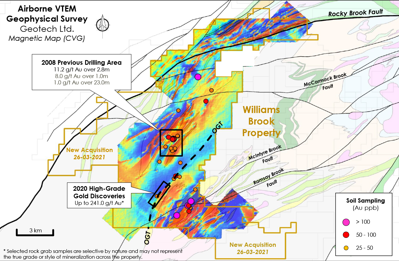 The Williams Brook Project survey area was flown in a northwest to southeast (N 130° E azimuth) direction with traverse line spacings of 100 metres. Tie lines were flown perpendicular to traverse lines at 1000m line spacings. The survey identifies multiples targets over the entire Williams Brook Gold property. Geophysical consultants are currently interpreting, filtering and finalizing the interpretation of the entire survey.