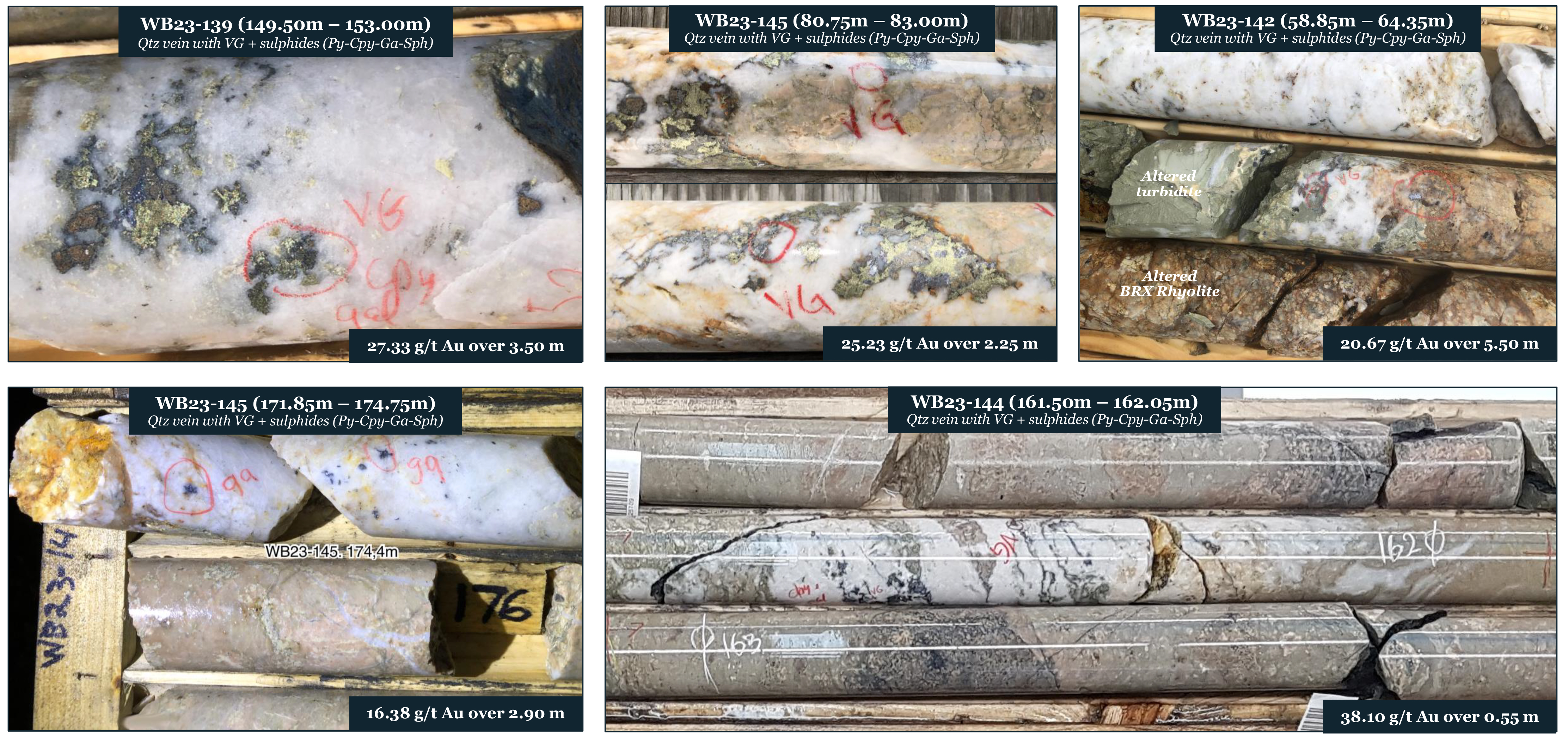 Hole WB23-140 intersected 6.70 m of 2.44 g/t gold starting at surface, followed by several high-grade intervals such as 3.95 m of 5.44 g/t gold and 3.25 m of 4.06 g/t gold at depth. Hole WB23-144 returned 6.60 g/t gold over 3.25 m from 158 m, and WB23-145 returned 1.01 g/t gold over 3.00 m from 246 m. Gold mineralization was still present at 249 m downhole depth, indicating that the system remains open. Today’s results expand the already wide distribution of the high-grade gold shoots, with mineralized intervals beginning at or near surface.