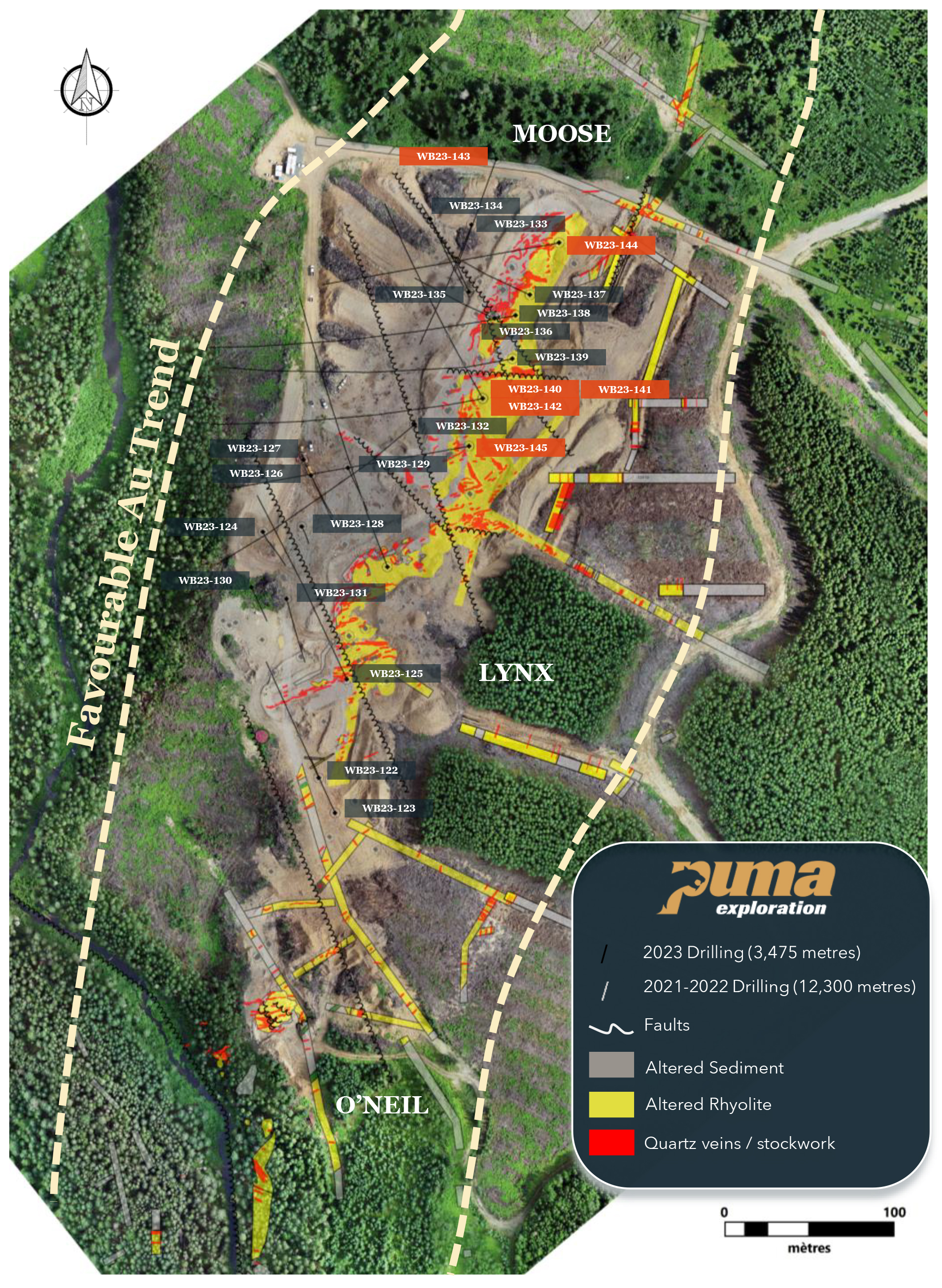 RIMOUSKI, Quebec, Nov. 16, 2023 – Puma Exploration Inc. (TSX-V: PUMA, OTCQB: PUMXF) (the “Company” or “Puma”) is pleased to announce the results of the last six (6) holes of its 2023 first phase drilling program at its 100%-owned Williams Brook Gold Project. All holes reported today successfully intersected the targeted favourable contact and a series of quartz veins and stockwork with gold mineralization. Drilling also extended the width and length of the high-grade gold shoots identified previously at Lynx and demonstrated the continuity of mineralization over long intervals (Figures 1 and 2).